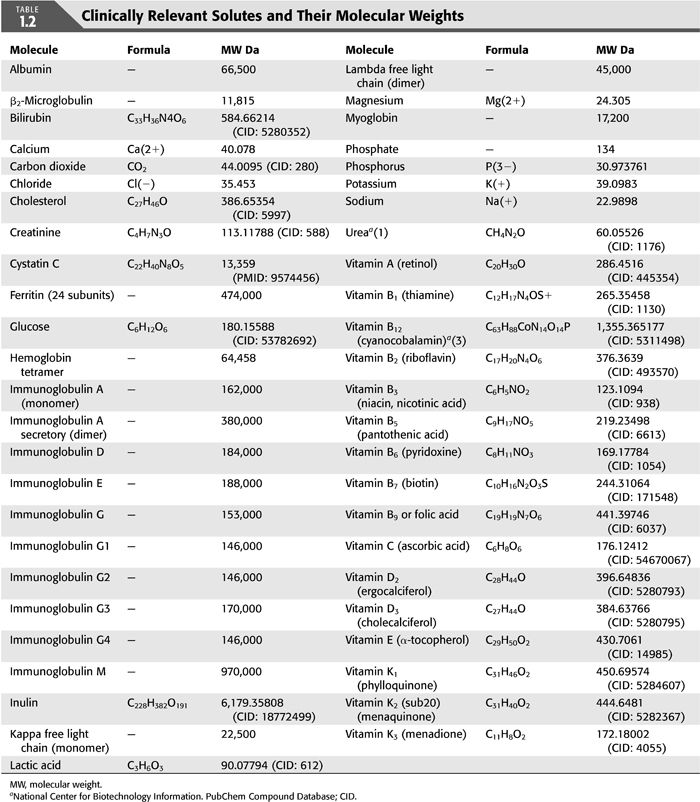 A small molecular weight (SMW) solute is one whose molecular weight is less than 500 Da. Examples include most nitrogen-based solutes such as creatinine and urea, lactic acid, cholesterol, most vitamins (A, B1, B2, B3, B5, B6, B7, B9, C, D2, D3, E, K1, K2, K3), and all electrolytes (TABLE 1.2).