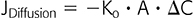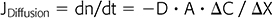 where JDiffusion (dn/dt) is flux in mol/s, D is diffusion constant in cm2/s, A is membrane surface area in cm2, ΔC is the concentration gradient in moles/cm3, and ΔX is thickness of the barrier to diffusion in cm. Since flux remains positive while the concentration gradient is dissipating, a minus sign is added to D.