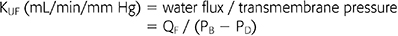 where QF is the ultrafiltration rate in mL/min, and PB − PD refers to the TMP gradient between the blood and the dialysis compartments. KUF is measured in vitro by the ultrafiltration of bovine blood at different TMPs (16). KUF is naturally dependent on membrane permeability to water, and thus, pore size is the major determinant of membrane flux; a membrane with larger pore sizes has the advantage of higher rates of water flux and a higher ultrafiltration capacity as well as a better removal of HMW solutes than membranes with smaller pore size.