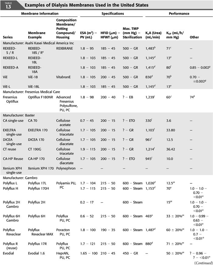 Dialysis membranes may be made of unmodified or regenerated cellulose, synthetically modified cellulose (SMC), or synthetic polymers (TABLES 1.1 and 1.3). Polymer-based synthetic membranes became commercially available in the 1970s and have since dominated the dialysis membrane industry; they tend to have higher performance, are more biocompatible, and their availability in high flux made it possible for patients to have a shorter HD time without jeopardizing dialysis adequacy (26). It must be noted though, that a dissociation between solute and water flux for membranes of any specific composition makes any simplified model of flux/composition classification almost impossible.